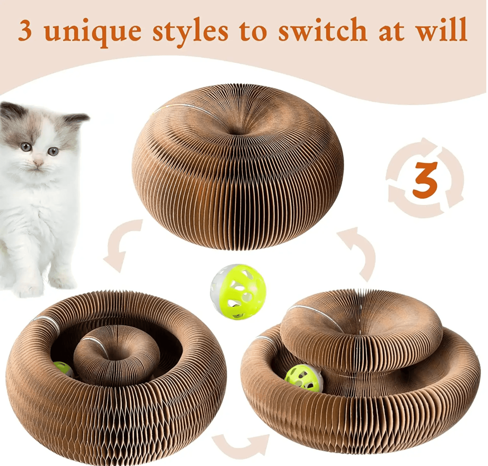 Pet parents will love the versatility of this toy! It serves as a scratcher, ball track, shape-shifter, and cosy bed all in one. Perfect for both playtime and nap time, it caters to your cat’s every need.