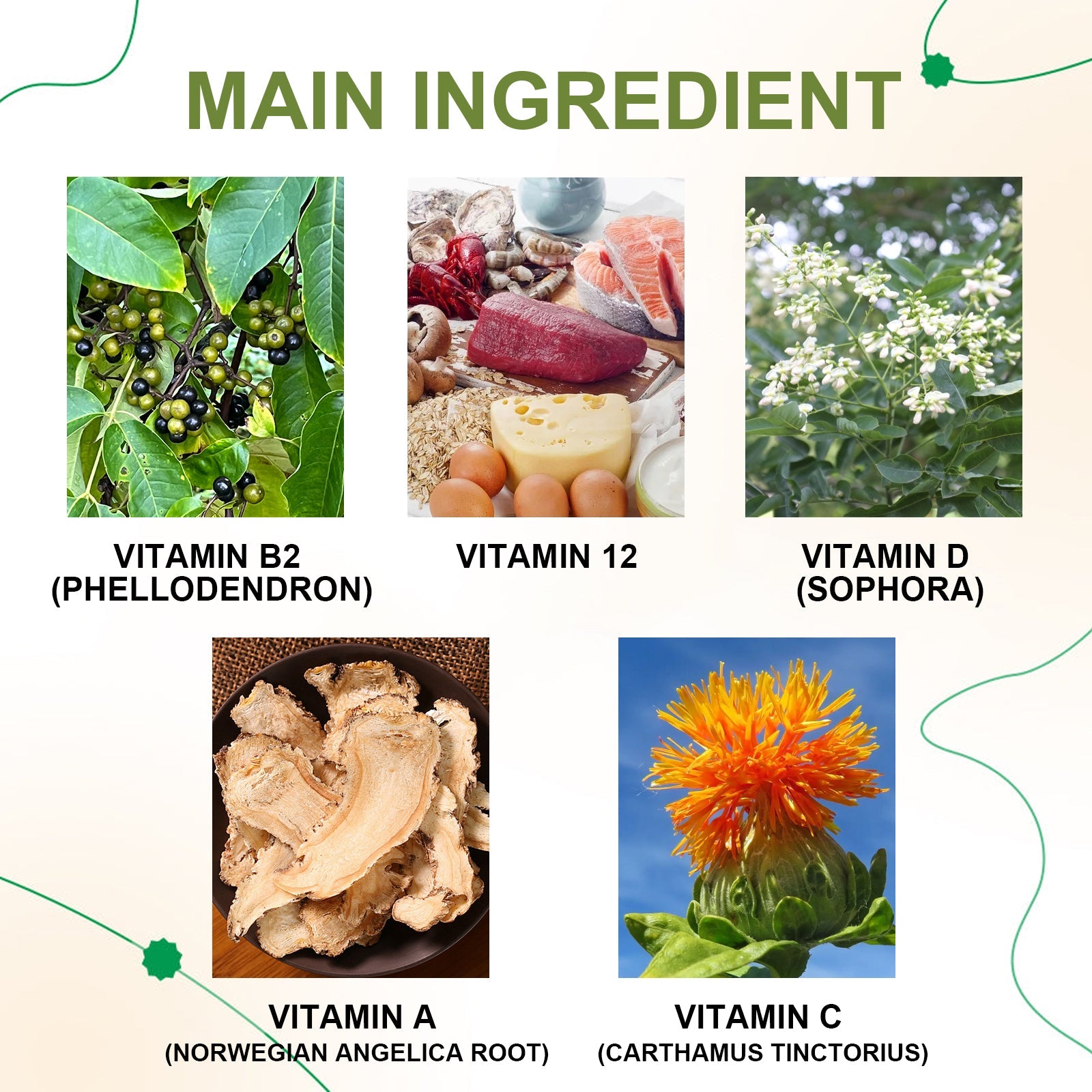 - Vitamin B2 (Phellodendron): Enhances blood flow, effectively halting the development of new varicose veins.