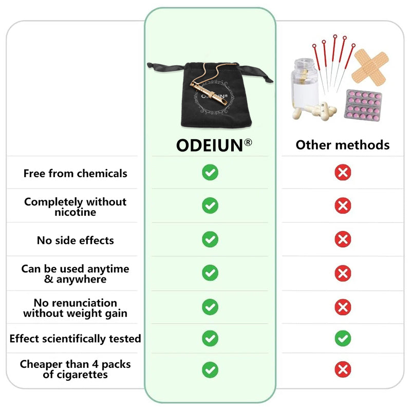 Conventional methods such as nicotine patches, acupuncture, hypnosis or medication quickly become very expensive and time-consuming. With ODEIUN you can enjoy the most affordable method of saying goodbye to smoking. Worry-free, simple and effective!
